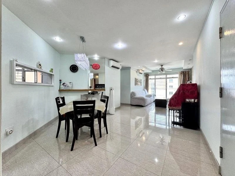 Step into this beautifully renovated HDB flat and be greeted by a modern minimalist ambiance that exudes sophistication. The well-maintained interiors are illuminated by natural light, highlighting the sleek finishes and custom built-in cabinetry. A striking black glossy TV feature wall serves as a focal point in the living room, while the purple accent wall in the master bedroom adds a touch of personality.