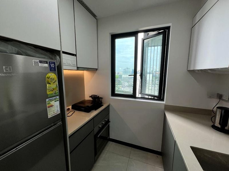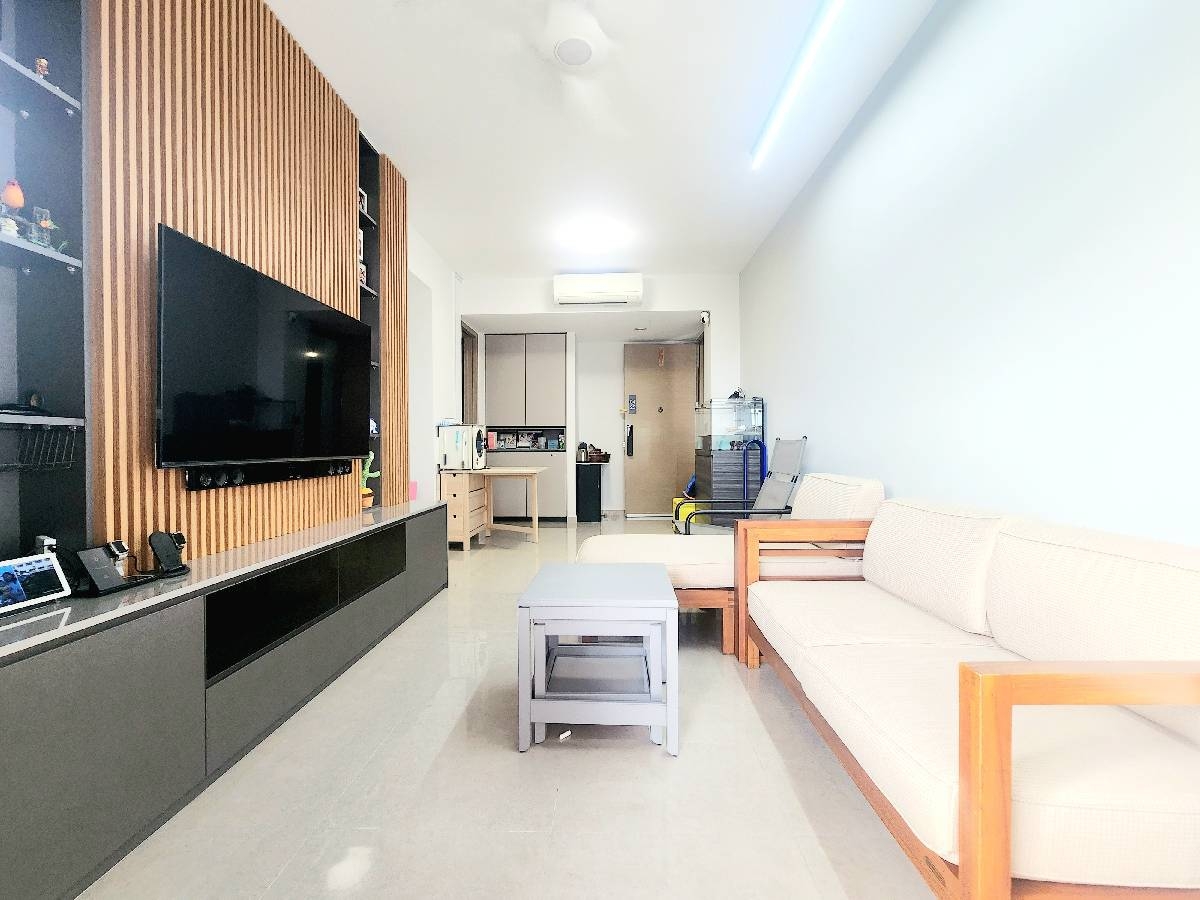 Step into a bright and airy living space that exudes modern minimalist charm. Abundant natural light floods through large windows, highlighting the sleek finishes and creating a warm ambiance. The open-concept layout seamlessly connects the living room to a private balcony, where you can unwind while enjoying unblocked views of lush greenery and the urban landscape.