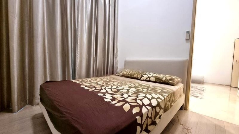This thoughtfully designed layout features spacious rooms, including a luxurious master suite with a built-in sliding wardrobe and a platform bed frame. The marble-look bathroom boasts a lavish bathtub and a glass shower partition, while the study offers custom built-in shelving and a large window for inspiring productivity. Each detail, from the recessed ceiling lights to the wood-look flooring, has been carefully curated to enhance your living experience.