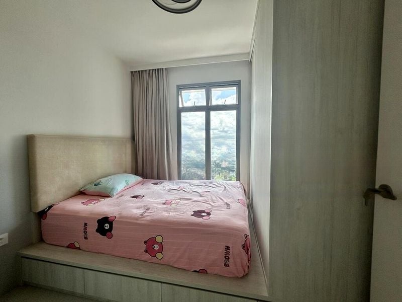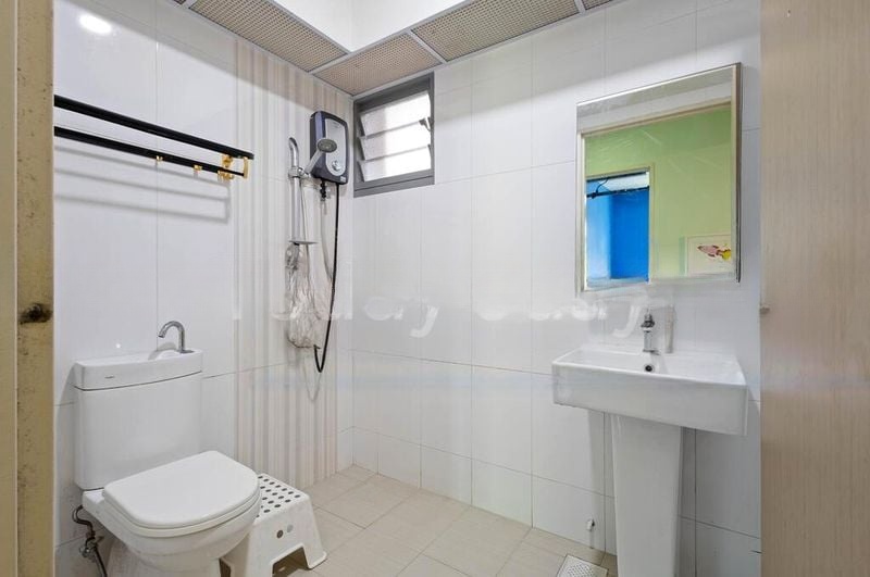 This well-maintained 3-bedroom unit features a modern layout with standout elements such as wall-hung toilets, contemporary vanity cabinets, and a luxurious rain shower in the bathroom. The kitchen boasts stylish two-tone cabinetry and white countertops, complemented by glass-front upper cabinets for a sleek finish. Each room is designed with comfort in mind, including a built-in wardrobe in the bedroom and a functional service yard equipped with an overhead drying rack.