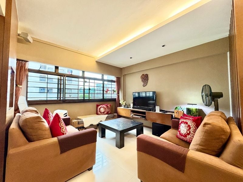 Step into a sanctuary of modern minimalism where natural light dances across the marble-look flooring, creating an inviting ambiance throughout the unit. The spacious living room, adorned with large windows, offers serene views of lush greenery and neighboring buildings, making it a perfect retreat from the bustling city.