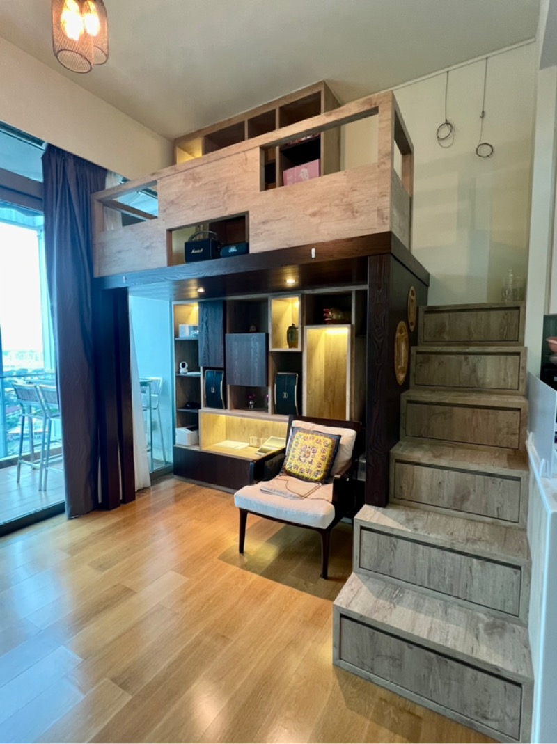 This efficient 614 sq.ft. 1-bedroom unit features a standout custom loft mezzanine, perfect for additional living space or a cozy reading nook. The open-concept kitchen boasts white gloss cabinetry and integrated appliances, seamlessly flowing into the living area adorned with built-in shelving and a decorative screen. The bedroom is a serene retreat, complete with a platform bed that includes storage, a glass-enclosed wardrobe, and floor-to-ceiling windows that enhance the airy feel.
