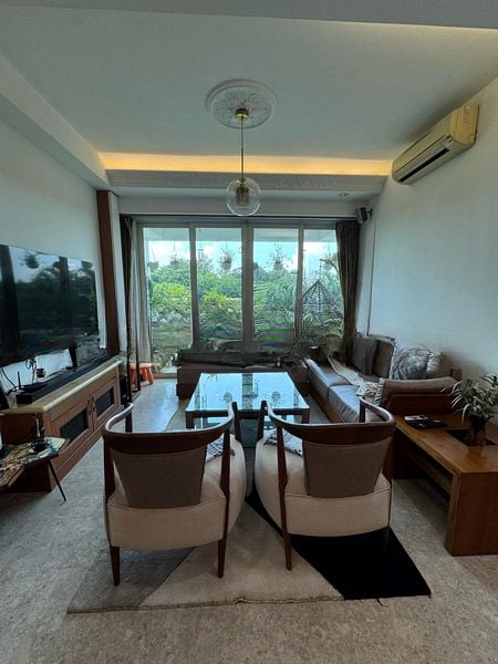 Step into this beautifully renovated unit at COTE D'AZUR and be greeted by an abundance of natural light that fills the cozy living space. The warm ambiance is accentuated by polished tile flooring and a striking wood-paneled TV wall, creating a welcoming environment to unwind. Large windows offer serene views of lush greenery, making this home a tranquil retreat in the heart of the city.