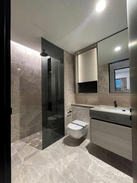 This 2-bedroom unit features a well-designed layout with standout highlights including a contemporary kitchen equipped with integrated Miele appliances, a luxurious bathroom with a walk-in shower and floating vanity, and a spacious balcony that seamlessly connects indoor and outdoor living. The minimalist finishes, such as light oak wood flooring and handleless cabinetry, enhance the modern aesthetic, creating a harmonious living space.