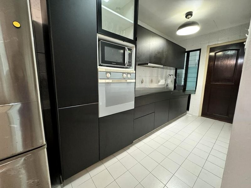 This thoughtfully designed unit features a spacious kitchen with light wood-grain cabinetry, perfect for culinary enthusiasts. The master bedroom boasts an ornate leather-padded headboard and full-height built-in wardrobes, ensuring ample storage. Each bedroom is well-appointed, with the common bathroom offering a relaxing integrated bathtub, making it an ideal retreat after a long day.