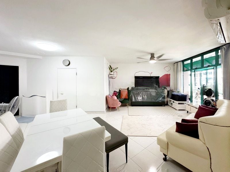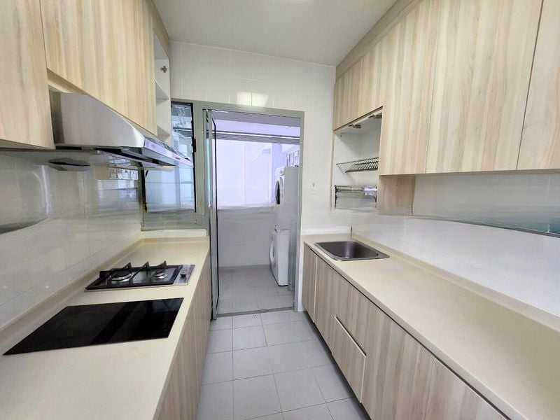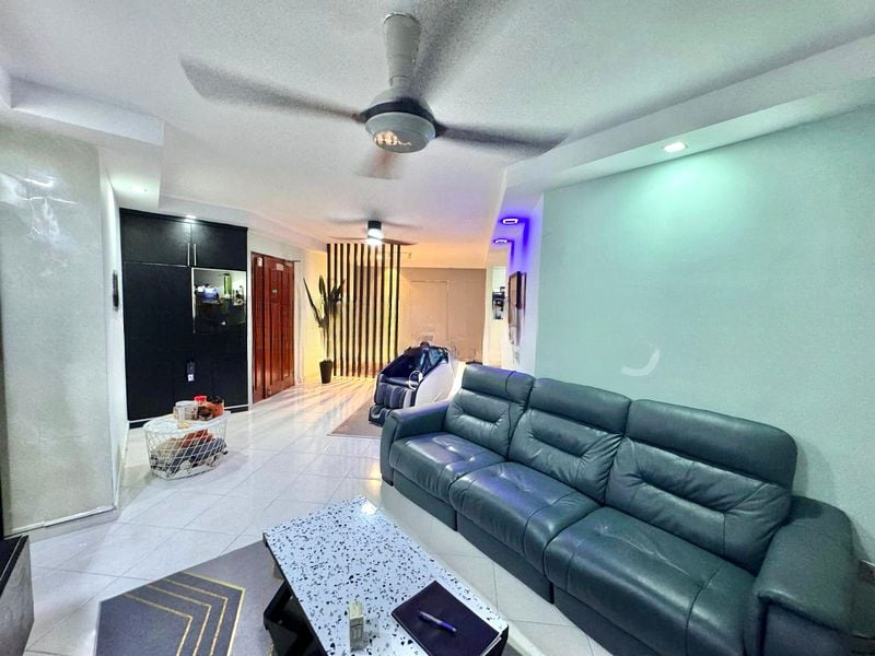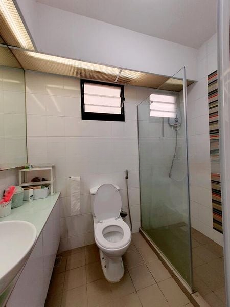 Step into this well-maintained 3-bedroom flat and be greeted by an ambiance that is both bright and functional. The open concept living area features large windows that invite natural light, complemented by recessed downlights and a ceiling fan, creating a welcoming atmosphere. The white tiled flooring adds a touch of elegance, while the urban views of neighboring residential blocks provide a sense of community.