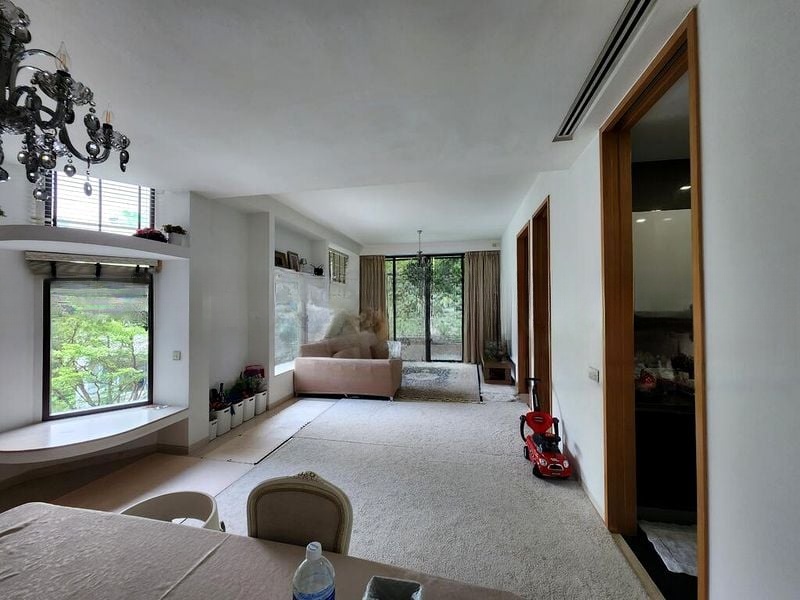 Step into this beautifully renovated unit at Belle Vue Residences and be greeted by an abundance of natural light that fills the bright and airy living and dining area. The polished stone flooring gleams under the ornate chandeliers, while floor-to-ceiling glass doors open to a spacious balcony, offering serene views of lush greenery and urban trees.