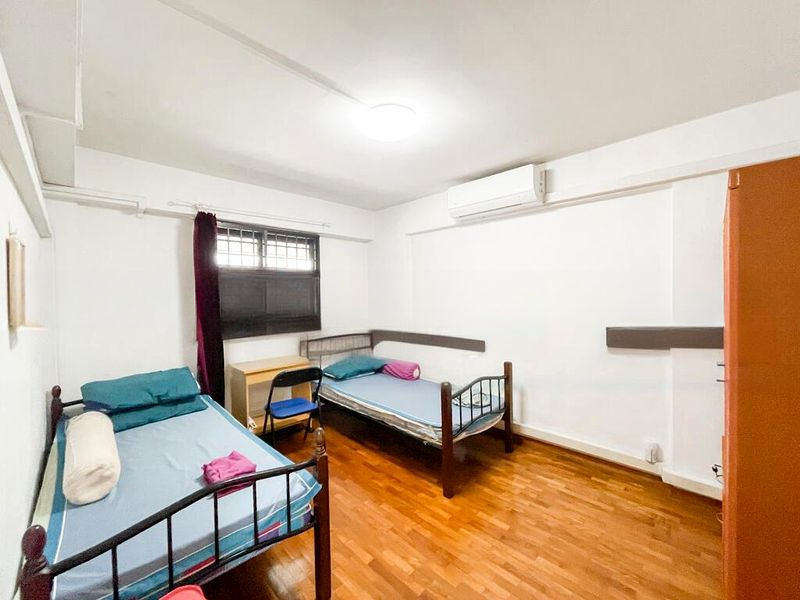 This 2-bedroom HDB flat features a practical layout with fully-furnished rooms. The kitchen boasts purple and white cabinetry complemented by sleek black countertops and a floral backsplash, perfect for culinary enthusiasts. The spacious bedroom includes a large wooden wardrobe and a study desk, while the bathroom is equipped with an instant water heater for your convenience.