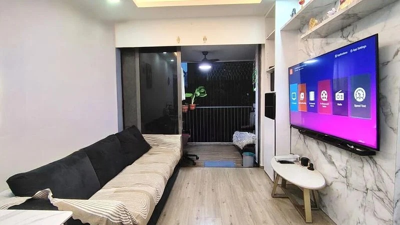 Step into a bright and airy sanctuary at Riverbank @ Fernvale, where abundant natural light floods the open-concept living space. The polished tile flooring and modern finishes create an inviting ambiance, while sliding glass doors lead to a charming balcony adorned with wood-look decking, offering unobstructed views of lush greenery and the city skyline.