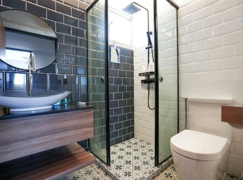 The layout is thoughtfully designed, showcasing a modern kitchenette with wood-grain laminate cabinets and a sleek black solid surface countertop. Enjoy the convenience of split-unit air conditioning and a ceiling fan in both the living area and bedroom, ensuring comfort year-round. The utility area is equipped with a washing machine and an overhead drying rack, maximizing functionality in this compact space.