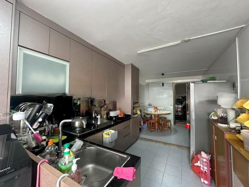 This unit features a practical layout with fully-furnished interiors, including built-in wardrobes in both bedrooms and a galley kitchen equipped with wooden cabinets and a gas hob. The elder-friendly design incorporates safety grab bars in the bathroom and a hospital-style bed in the master bedroom, ensuring comfort and accessibility for all family members. An internal rubbish chute adds to the convenience of daily living.