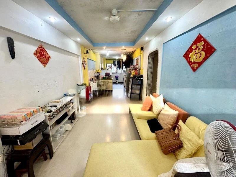 This well-maintained 4-room flat features an efficient layout, including a master bedroom with en-suite access and two additional bedrooms perfect for family or guests. The modern kitchen boasts wood-grain cabinetry and grey countertops, seamlessly connecting to a service yard equipped with convenient laundry facilities. Every detail, from the glass shower enclosure in the bathroom to the built-in floor-to-ceiling storage cabinets, reflects quality and thoughtful design.