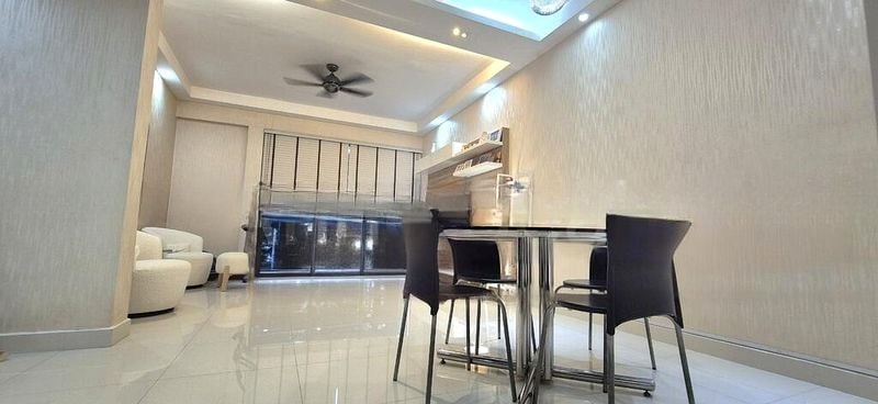 Step into this beautifully renovated 2-bedroom unit at Aston Mansions, where abundant natural light floods the open-concept living space, highlighting the elegant wood paneling of the TV feature wall and the sleek white tiled flooring. The modern minimalist ambiance is complemented by large windows that frame serene views of the swimming pool and urban landscape, creating a tranquil retreat in the heart of Geylang.
