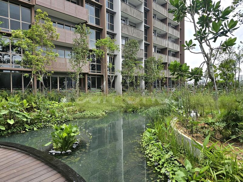 Step into a sanctuary of modern minimalism, where abundant natural light floods through floor-to-ceiling windows, illuminating the sleek marble-look wall tiles and the serene views of the landscaped pond. The ambiance is tranquil, enhanced by the gentle sounds of water features and the lush greenery that surrounds your new home.