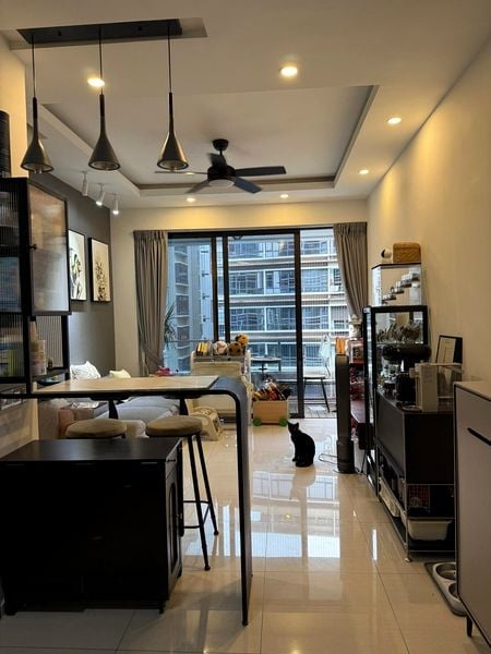 Step into a world of modern elegance as you enter this beautifully maintained unit at D'NEST. Bathed in abundant natural light, the open concept living and dining area features polished tile flooring and large sliding glass doors that seamlessly connect to a private balcony. Enjoy tranquil views of the swimming pool and the urban landscape, enhanced by stylish pendant lighting that adds a touch of sophistication.