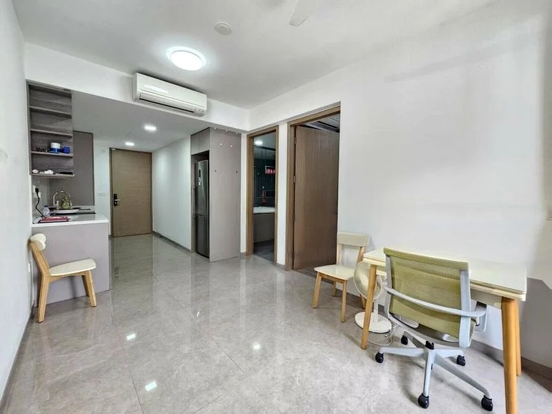 Step into a world of modern elegance as you enter this beautifully renovated unit at The Tapestry. Bathed in abundant natural light, the open-concept living area features a sleek floating TV console and a large projector screen, perfect for cozy movie nights. The glass balcony railing invites you to enjoy serene views of lush greenery, creating a tranquil ambiance that complements the minimalist design.