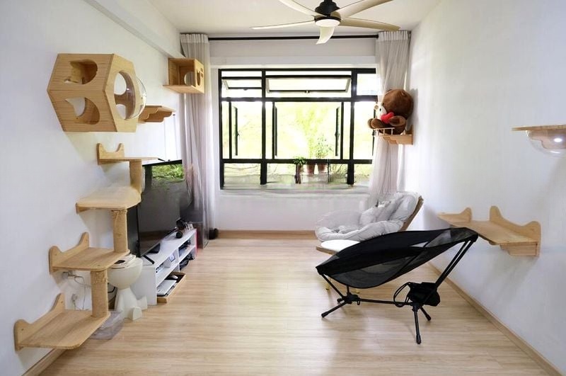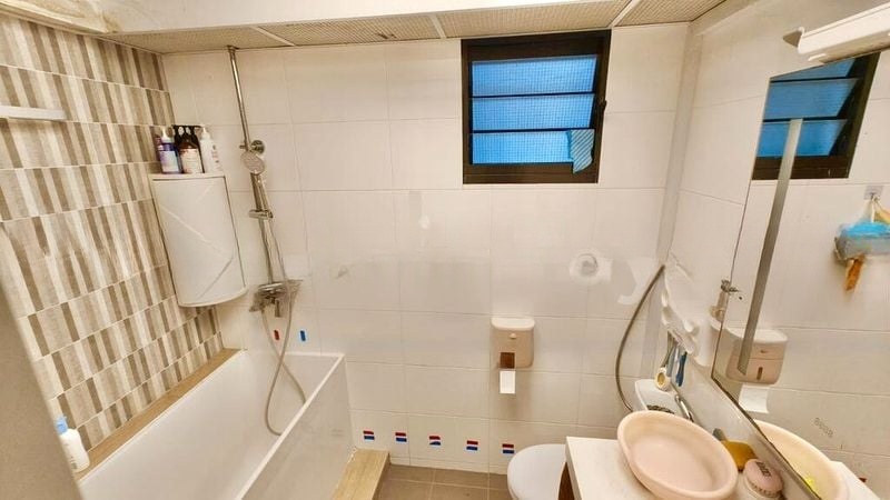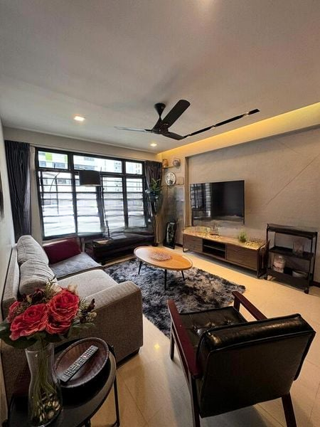 Step into a world of elegance and comfort as you enter this beautifully renovated 3-bedroom flat. The abundant natural light floods the space, highlighting the stunning white marble-look floor tiles and creating a bright and airy ambiance. Enjoy picturesque views of lush greenery and the urban landscape from your living room, which features a large L-shaped leather sofa and a stylish decorative screen partition.