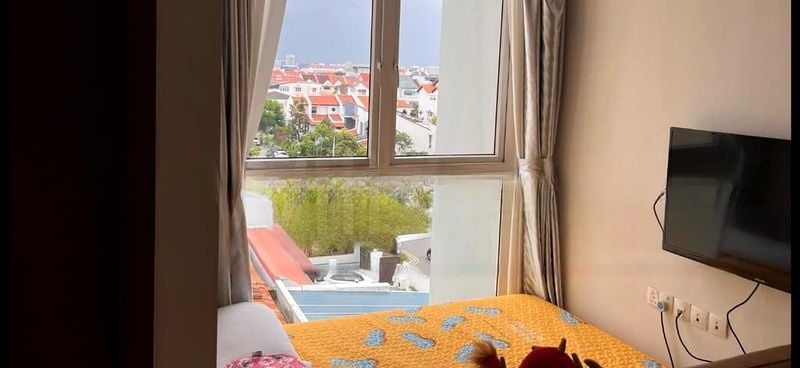 Step into a warm and inviting space where natural light dances across the cozy interiors of this well-maintained 1-bedroom unit. The soft beige tones of the padded headboard and the gentle glow from the wall-mounted TV create a serene ambiance, perfect for relaxation. Large windows adorned with sheer and blackout curtains frame picturesque views of the residential area, complemented by the charming red roofs and lush greenery outside.