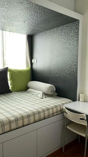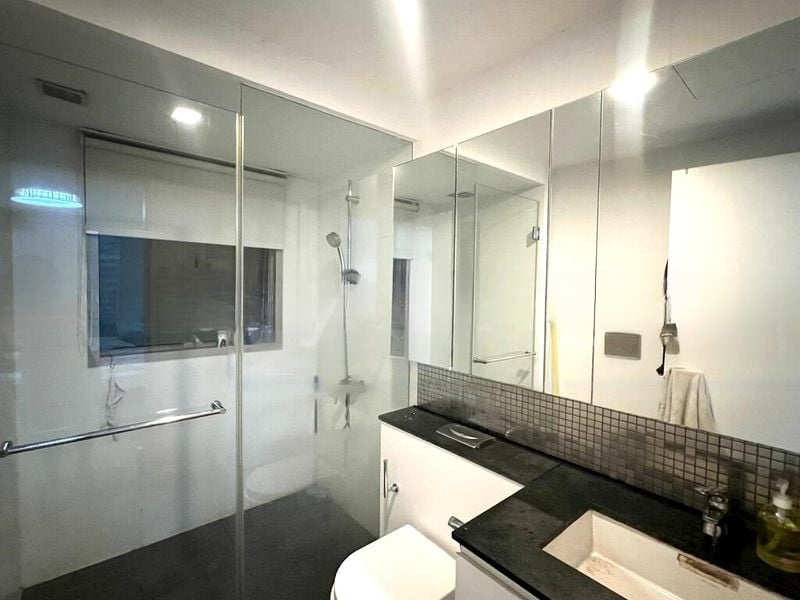 This well-designed 3-bedroom unit features a spacious living room with tiled flooring and sliding glass doors that seamlessly connect to the balcony. The galley kitchen boasts sleek black countertops and ample storage with both white upper and dark lower cabinets. Each bedroom is thoughtfully laid out, with wood-look flooring and large windows that enhance the sense of space and light. A dedicated study area provides a perfect workspace bathed in natural light.