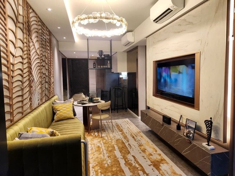 Step into a world of modern luxury as you enter this brand-new designer unit at THE M. Bathed in abundant natural light, the open-concept living area showcases a striking geometric feature wall and a contemporary chandelier, while floor-to-ceiling windows offer breathtaking views of the city skyline and lush greenery.