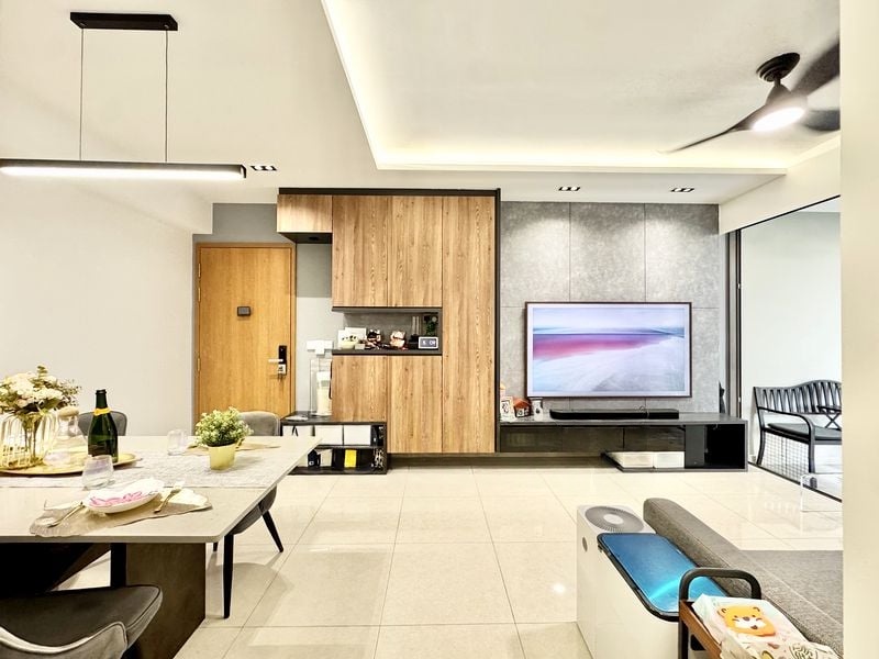 Step into a modern minimalist haven at Rivercove Residences, where natural light dances across the open-concept living area, highlighting the stunning stone-look feature wall and integrated wood cabinetry. The recessed ceiling lighting adds a touch of elegance, creating a warm and inviting ambiance that welcomes you home.