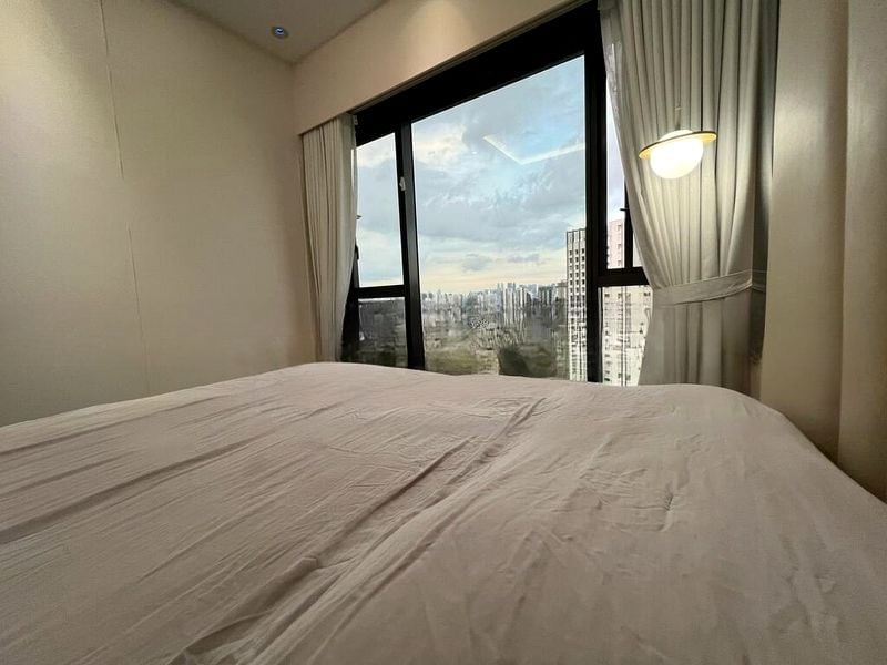 Step into a bright and airy sanctuary where abundant natural light floods through sliding glass doors, revealing breathtaking panoramic views of the city skyline and lush greenery. The designer finishes, including marble-look flooring and dark veined marble accents in the bathroom, create an elegant ambiance that invites relaxation and comfort.