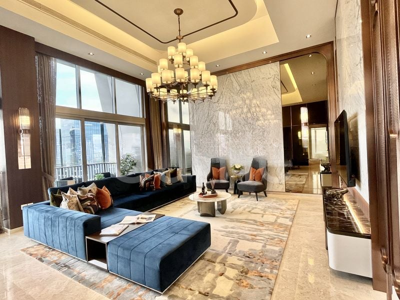Step into a realm of modern luxury where abundant natural light floods through floor-to-ceiling windows, illuminating the exquisite book-matched marble feature wall and the grand tiered chandeliers that grace the double-volume high ceilings. The ambiance is both inviting and sophisticated, creating a perfect backdrop for your lifestyle.