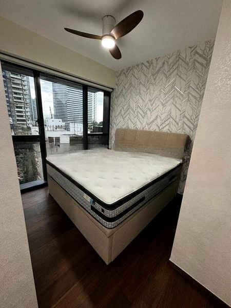 Step into this modern and functional unit at THE M, where abundant natural light floods through floor-to-ceiling windows, illuminating the elegant grey marble-look floor tiles and the striking wood-paneled feature wall. The ambiance is both inviting and sophisticated, offering a perfect blend of comfort and style, with views of the vibrant city skyline that will leave you in awe.