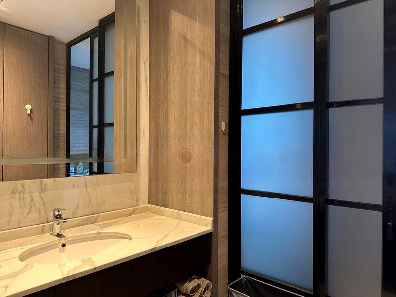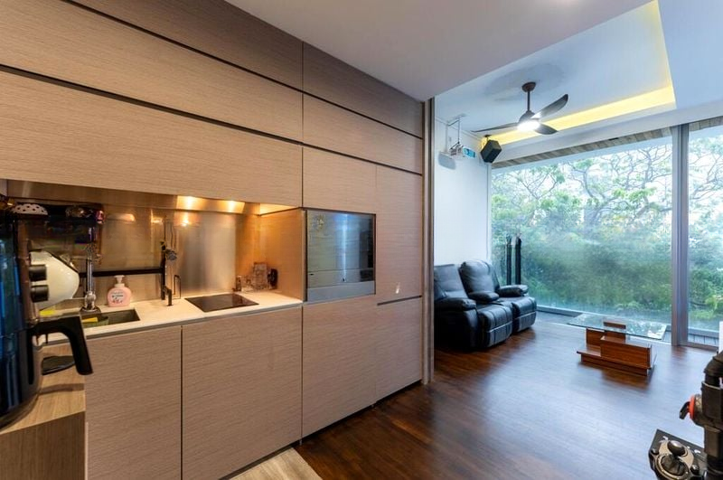 Step into a serene oasis where abundant natural light floods through floor-to-ceiling glass windows, illuminating the high ceilings and showcasing the stunning tropical landscaping. The inviting ambiance is enhanced by the soothing sounds of a koi pond and water feature, creating a tranquil retreat right at home.