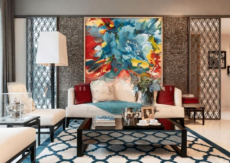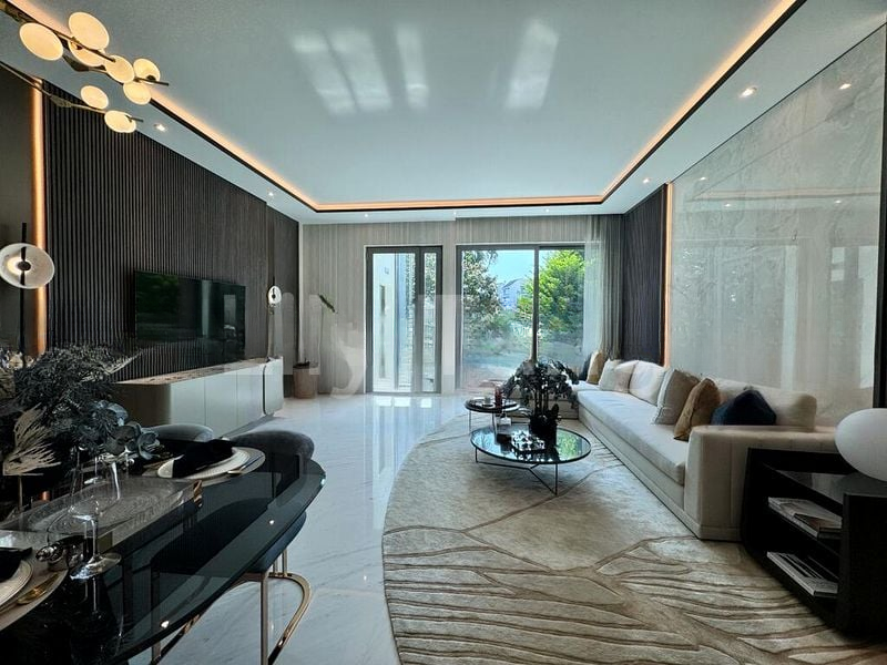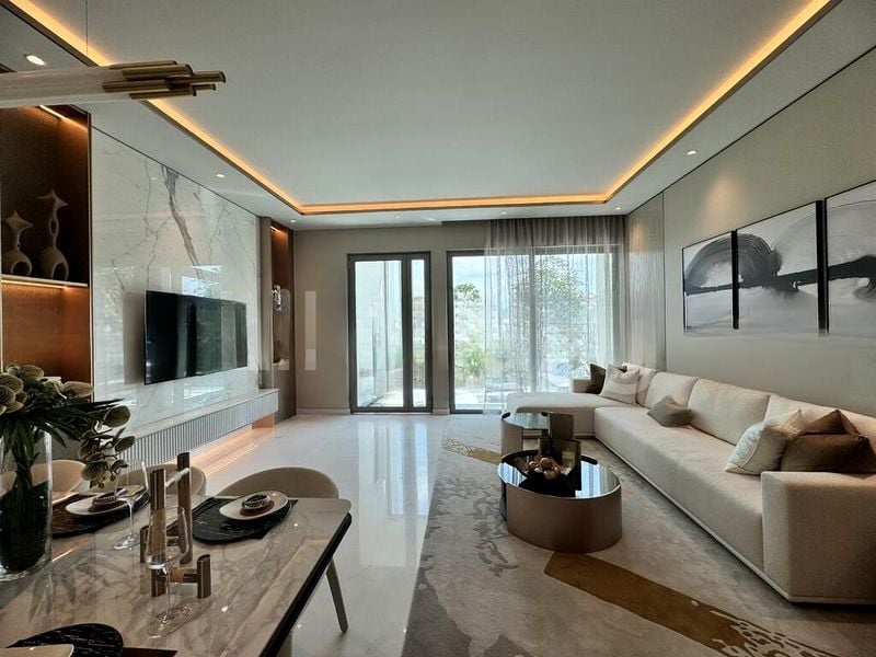 Step into a world of modern luxury as you enter this brand-new designer unit at The Residences at W Singapore Sentosa Cove. Bathed in abundant natural light, the open-concept living room features a stunning dark wood-slatted feature wall and elegant marble-look flooring, creating an inviting ambiance that seamlessly blends sophistication with comfort. Floor-to-ceiling windows frame picturesque views of lush greenery and the shimmering pool, enhancing the serene atmosphere.
