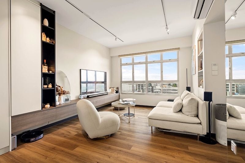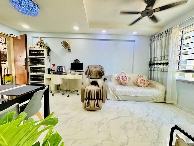 Step into a beautifully renovated 3-bedroom flat where abundant natural light floods the open-concept living area, accentuating the modern minimalist ambiance. The striking wood-paneled TV feature wall and polished white floor tiles create an inviting atmosphere, while large windows offer delightful views of the urban landscape and neighboring HDB blocks.