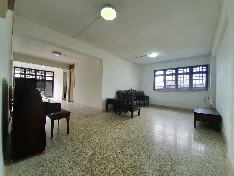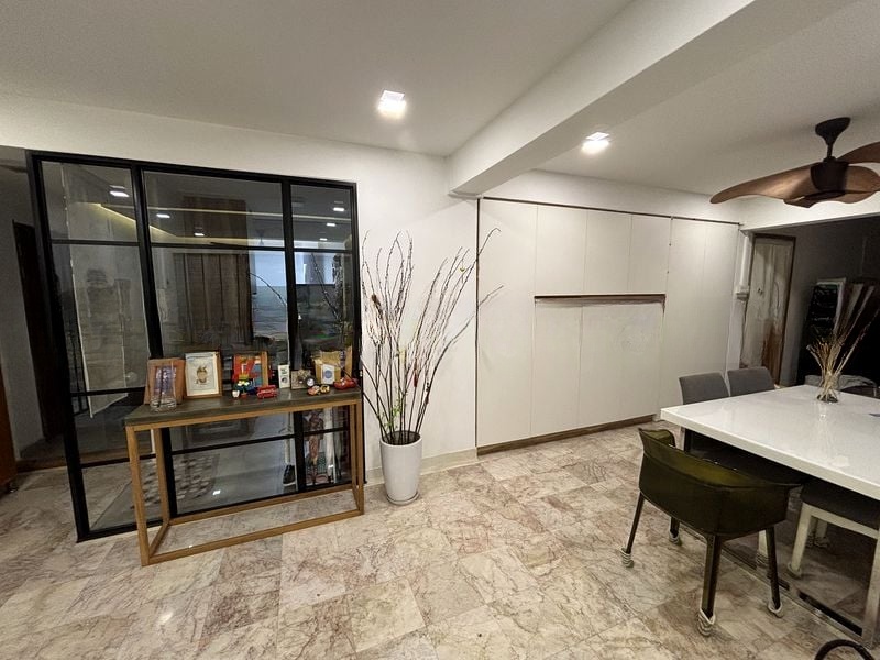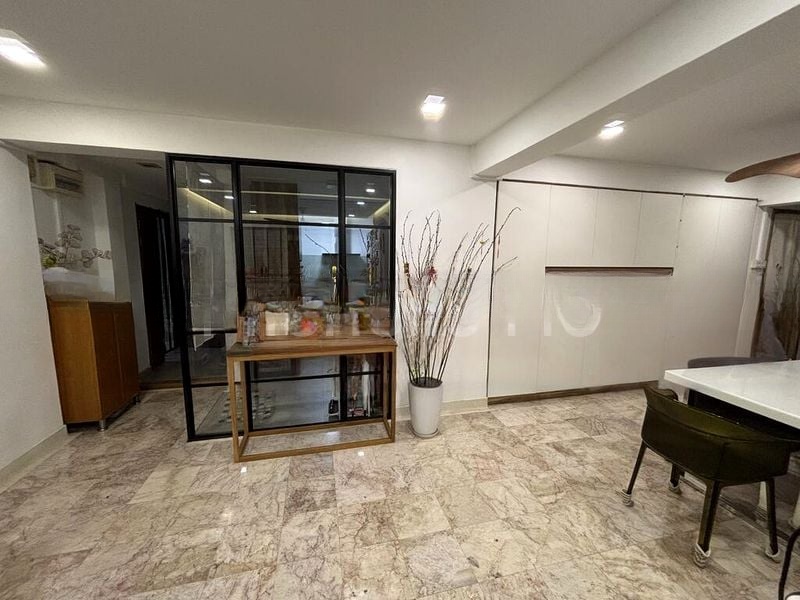 Step into a world of functional charm as you enter this spacious HDB flat at 51 Sims Drive. The open layout of the living room, adorned with large format floor tiles and bright white walls, invites natural light to fill the space, creating a warm and welcoming ambiance. Arched doorways add a unique touch, while the extensive kitchen cabinetry offers ample storage for all your culinary needs.