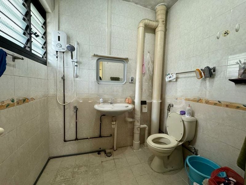 This 3-bedroom unit boasts a well-thought-out layout, featuring a galley kitchen with grey laminate cabinets and a tiled backsplash. Each bedroom is equipped with built-in wardrobes and dedicated study areas, perfect for both relaxation and productivity. The bathrooms, though original, are functional and include modern amenities like instant water heaters and wall-mounted mirror cabinets.