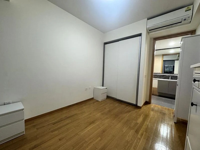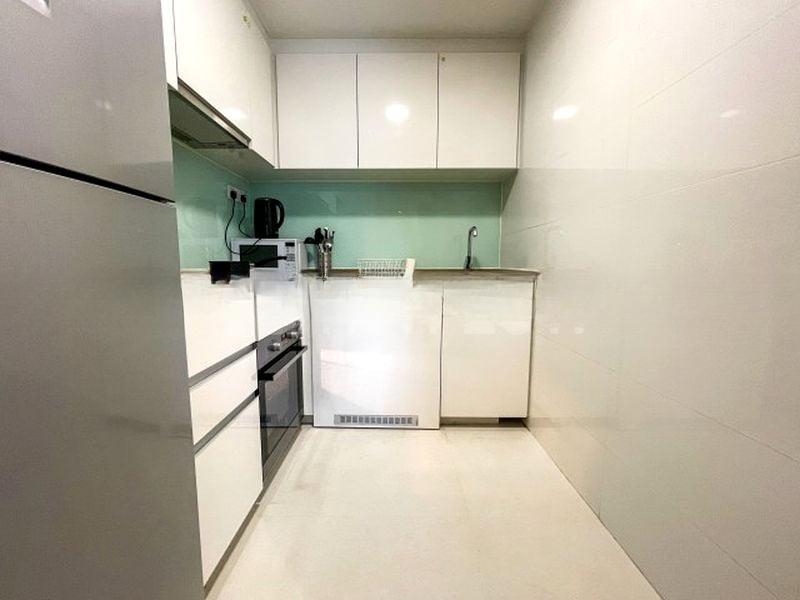 This well-designed unit features a modern galley kitchen equipped with a gas hob and built-in oven, perfect for culinary enthusiasts. The bathrooms are a highlight, boasting marble-patterned wall tiles and a luxurious rain shower within a glass enclosure. Each bedroom offers a serene retreat with light wood flooring and ample storage, ensuring comfort and convenience for your lifestyle.