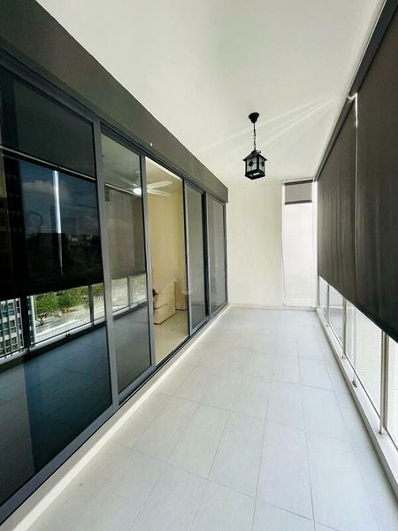 Step into a world of light and space in this beautifully maintained 2-bedroom unit at Bartley Ridge. The bright and airy ambiance is accentuated by abundant natural light streaming through floor-to-ceiling windows, offering stunning views of the pool and lush greenery. The glossy white floor tiles in the living room enhance the open layout, creating a welcoming atmosphere that invites relaxation.