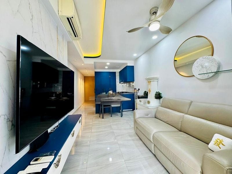 This well-maintained unit features a spacious master bedroom with floor-to-ceiling windows and a stylish blue upholstered headboard, while the second bedroom is equipped with a built-in study desk and ample storage. The kitchen boasts integrated appliances and a chic marble-look backsplash, making it a culinary delight. With designer finishes throughout, including decorative gold lattice doors and recessed ceiling lighting, this home is both functional and aesthetically pleasing.