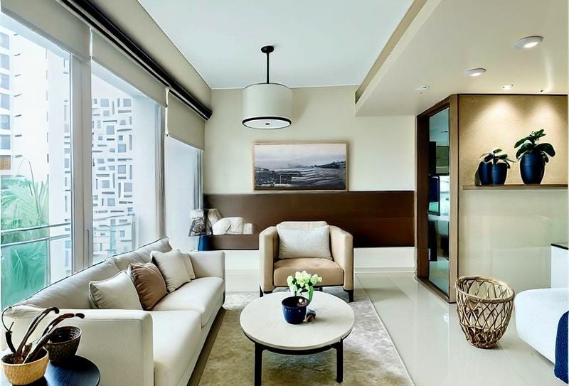 Step into this brand-new, designer unit at THE M and be captivated by the abundant natural light flooding through the floor-to-ceiling sliding glass doors. The modern minimalist ambiance is accentuated by grey marble-look floor tiles and a breathtaking panoramic view of the city skyline, creating a serene yet vibrant living space that feels both luxurious and inviting.