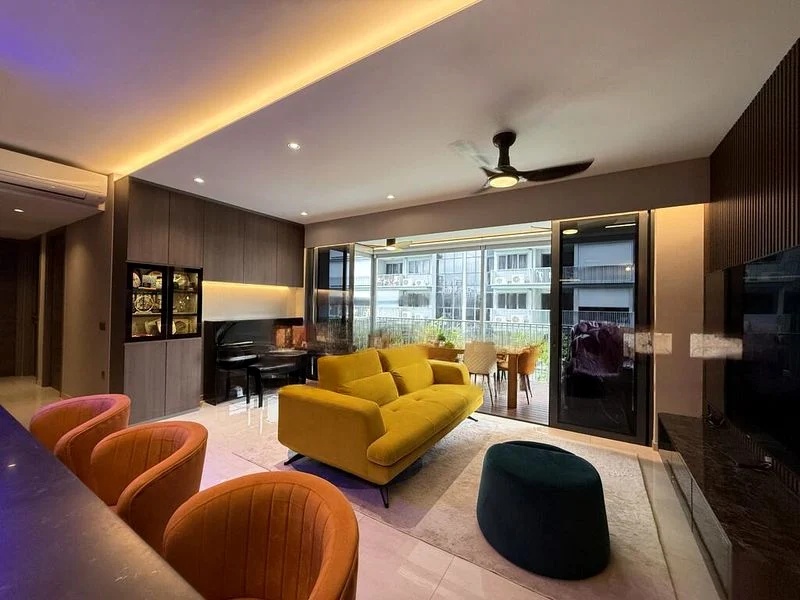 Step into a realm of modern luxury where abundant natural light floods the open-concept living space, accentuating the designer finishes and custom cabinetry. The inviting ambiance is enhanced by cove lighting and a seamless flow to the timber-decked balcony, offering serene views of the pool and lush greenery.