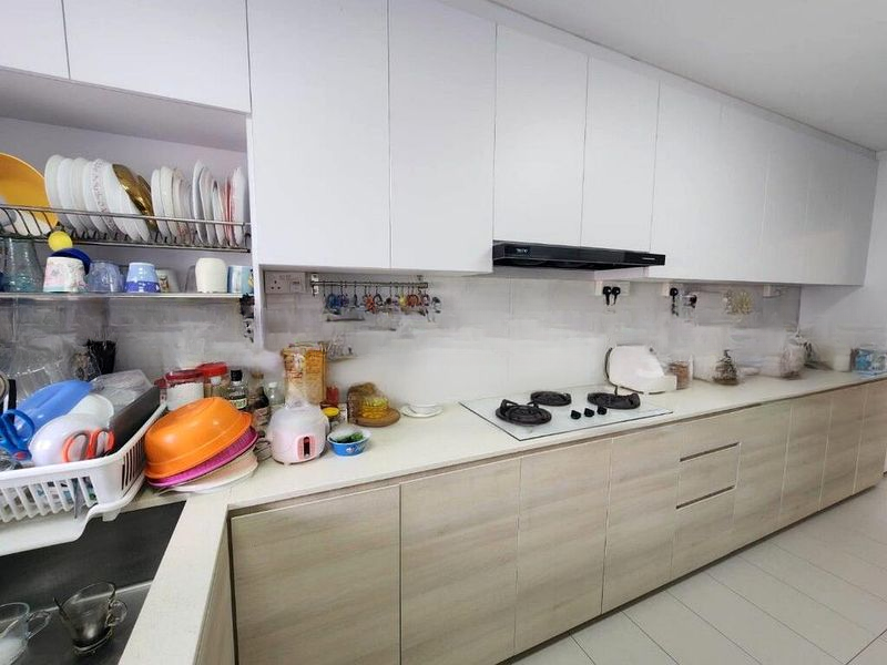 Step into a bright and airy sanctuary at 248 Bangkit Rd, where modern finishes and a thoughtful layout greet you. The open-concept living and dining area is adorned with polished floor tiles and a large built-in display cabinet featuring vibrant yellow accents, creating a warm and inviting atmosphere. Natural light filters through, enhancing the serene views of lush greenery that surround the unit.