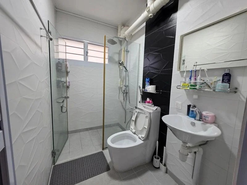 Step into this beautifully renovated HDB flat and be greeted by an inviting ambiance, where modern finishes meet functional living. The dark wood-look vinyl flooring flows seamlessly throughout, complemented by natural light filtering through the windows, offering a glimpse of the vibrant urban landscape beyond.
