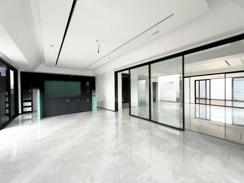 Step into a world of elegance and sophistication in this brand-new landed home at Golden Rise Estate. The moment you enter, you are greeted by a bright and airy ambiance, accentuated by large format marble-look floor tiles and expansive floor-to-ceiling glass sliding doors that invite the lush greenery and neighborhood views inside. The open-concept living room, highlighted by a striking black feature wall, creates a perfect space for relaxation and entertainment.