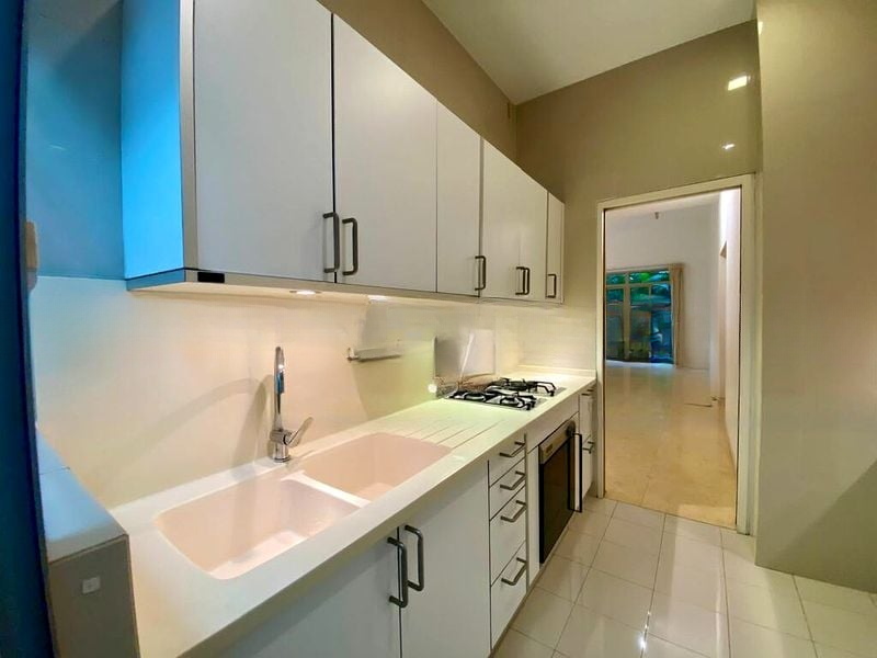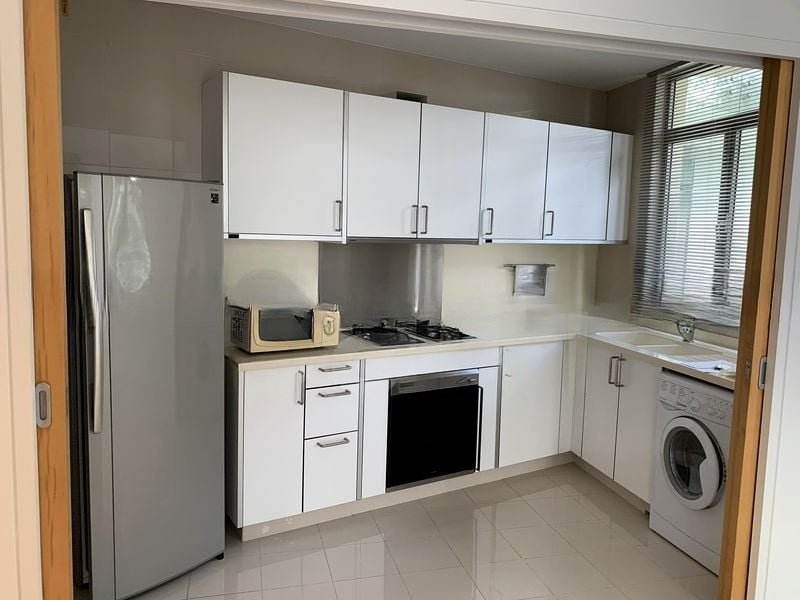 This spacious 2-bedroom, 3-bathroom layout features a well-appointed kitchen with white cabinetry, a double kitchen sink, and a gas cooktop, perfect for culinary enthusiasts. The living room boasts elegant wood-look flooring and track lighting, while the outdoor patio is ideal for relaxation amidst potted plants and fruit trees, enhancing your tranquil lifestyle.