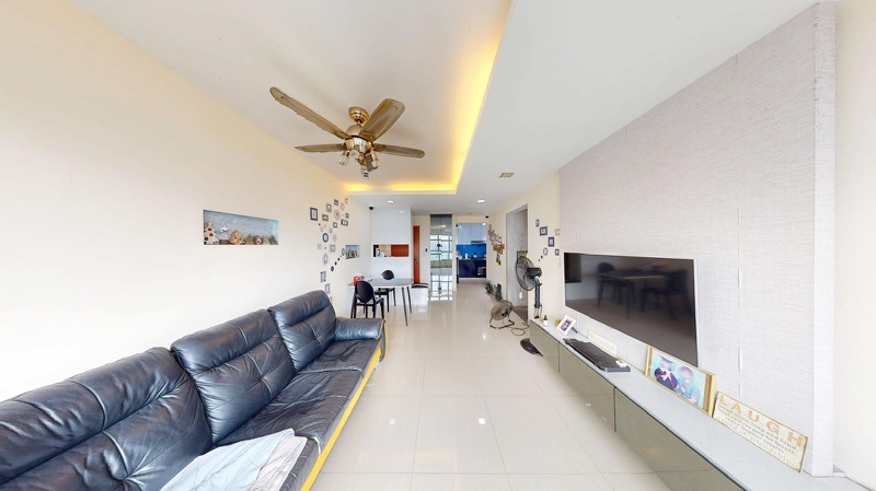 This efficient 4-room point block layout features three well-appointed bedrooms, including a master bedroom adorned with blue textured wallpaper and large windows that frame urban views. The dedicated study area, complete with a long built-in desk and integrated shelving, is ideal for remote work or study. With two modern bathrooms and a service yard, this unit is designed for comfortable living.
