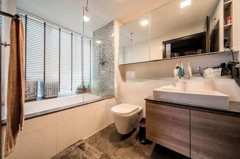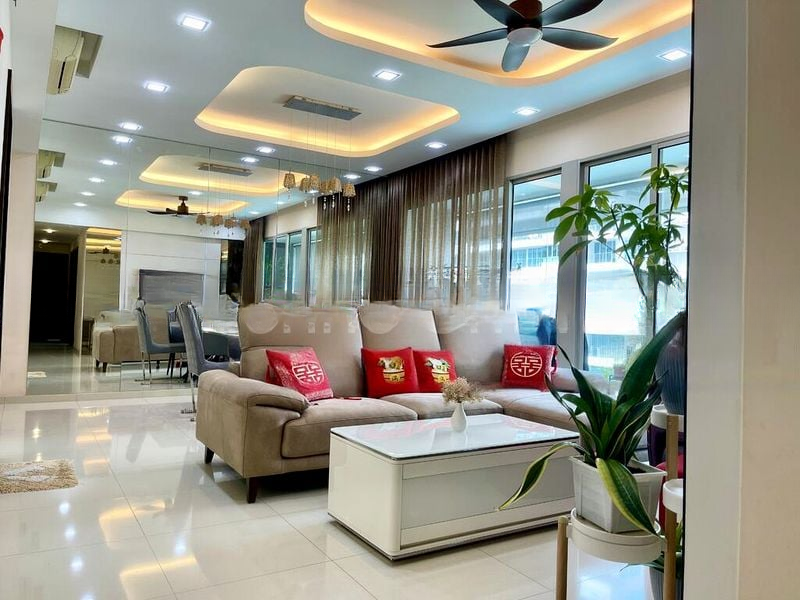 Step into this beautifully renovated 3-bedroom unit at LIVIA, where modern minimalist design meets functionality. The open-concept living space is bathed in natural light, showcasing a stylish geometric rug and a large flat-screen TV, complemented by designer pendant lights that add a touch of elegance. Enjoy serene views of lush greenery and neighboring residential blocks from the comfort of your home.
