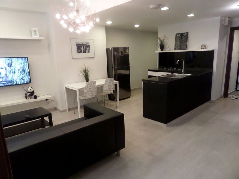 Step into a bright and airy sanctuary at International Plaza, where abundant natural light floods through large floor-to-ceiling windows, revealing breathtaking views of the city skyline and the sea. The polished wood flooring and elegant crystal chandelier in the living room create an inviting ambiance, perfect for both relaxation and entertaining.