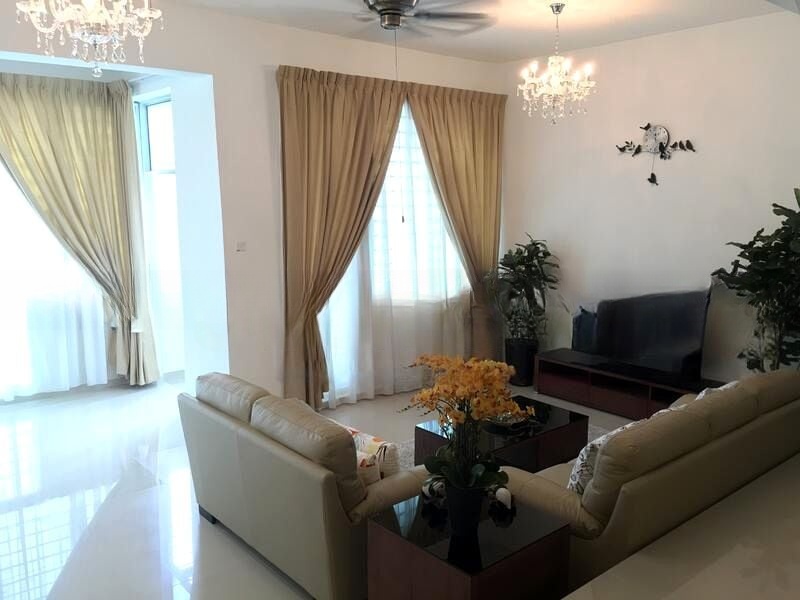 Step into a warm and inviting space, where abundant natural light dances across polished tile flooring, highlighting the dual chandeliers that grace the living room. The vibrant orange cabinetry in the kitchen adds a splash of personality, while the large windows draped with full-length curtains create a cozy atmosphere, perfect for relaxation.