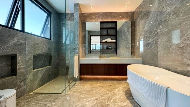 This exquisite property boasts six spacious bedrooms, each designed with wood-look flooring and floor-to-ceiling windows that enhance the bright, airy feel. The open-plan kitchen features sleek white cabinetry and an integrated design, perfect for culinary enthusiasts. With standout elements like recessed air conditioning, a wooden slat staircase partition, and a covered patio area, this home is a true masterpiece of modern living.