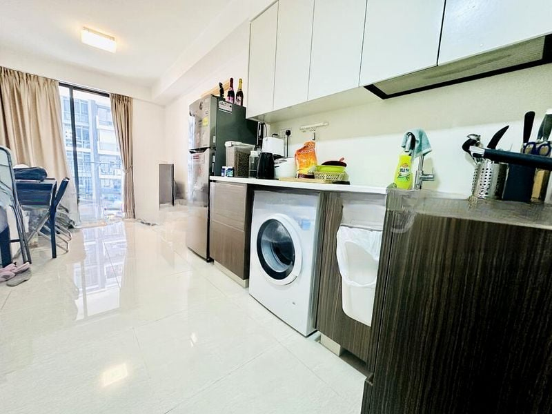 The well-designed layout features a fully-furnished kitchenette equipped with modern amenities, including an integrated washing machine and built-in microwave, alongside dual-tone cabinetry and a stylish tiled backsplash. The spacious bedroom boasts wood-look laminate flooring, a built-in wardrobe, and a large window that invites in more light. The bathroom is a luxurious haven with a rain shower head and a wall-hung vanity, ensuring comfort and convenience.