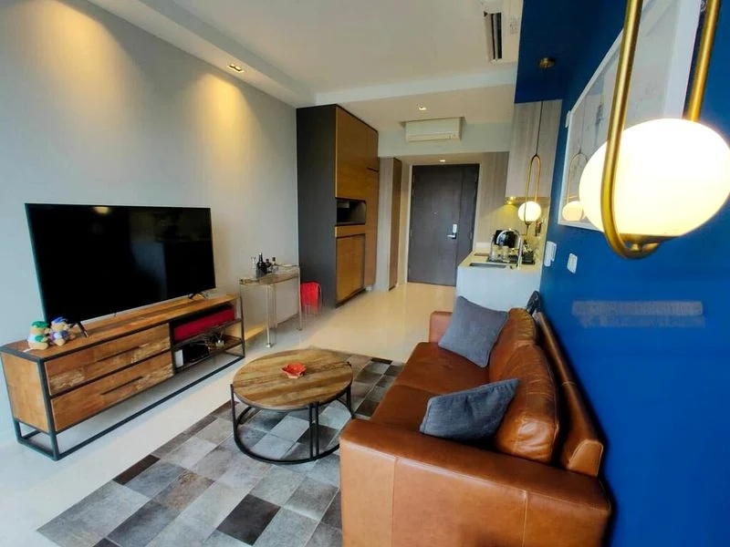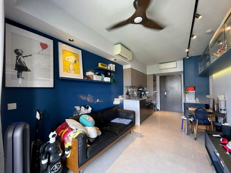 This efficient 2-bedroom, 2-bathroom layout features a master bedroom with an en-suite bath, complemented by a second bedroom and a common bathroom. The living area, enhanced by a stylish glass partition wall and a ceiling fan, offers a perfect blend of comfort and functionality. Partial furnishing allows you to personalize the space to your liking while maintaining the original charm of the unit.