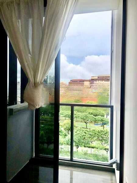 Step into a bright and airy living space where abundant natural light floods through floor-to-ceiling windows, illuminating the polished tile flooring. The seamless flow from the living room to the balcony invites you to enjoy stunning views of the city skyline and surrounding greenery, creating a serene urban retreat.